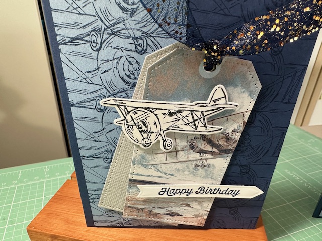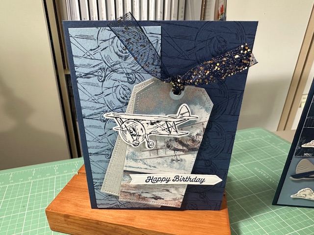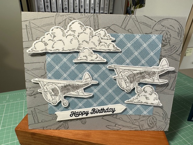 I just can’t get enough of this Adventurous Sky bundle 163447 and the Take To the Sky DSP 163436 as the combo of the stamp, die and DSP and Navy Blue, Balmy Blue, Smokey Slate, Basic White card stock to make this great card I cased from Rose Wards blog and Facebook live Video (or Youtube Video) posted on 4/19/24. She made several cards with this bundle and DSP as parts of this card is a cut out DSP piece from the one piece of DSP (the white images of the planes is a 4 x 5 dsp peice) in this pack where you can use several different patterns on different cards (which I will show in the next 4 or 5 cards to be posted. Very smart of Rose to see the potential of the DSP and her great creations.