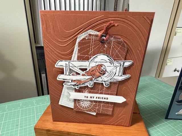 Love, love, love this Adventurours Sky bundle 163447 and the Take the the Sky DSP 163436 as they both make such excellent guy cards for any guy on your card list. This card used the So Swirly embossing folder for the back of the card 163791. I cased this card from Rose Ward from her Youtube post from Stampers Delight on 4/19/24. The Tags shown on this card ass pieces that you an cut out from the DSP piece that has tags and several 3 x 5 patterns (as from the card I showed earlier) with about 6 different patterns like this that you and put on the card as a cool background. Rose made several cards this way and you will be seeing the rest of using a different piece of DSP on each card. Rose is so talented just love all her cards. Enjoy my friends.