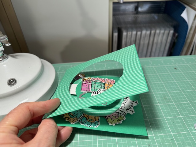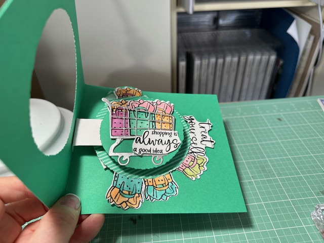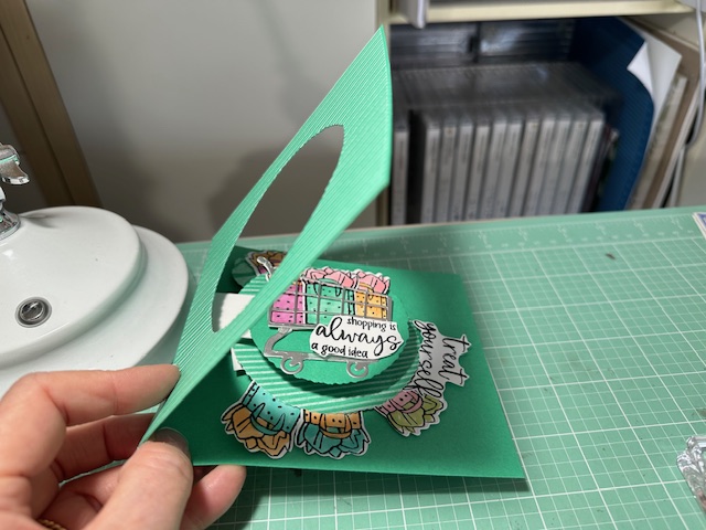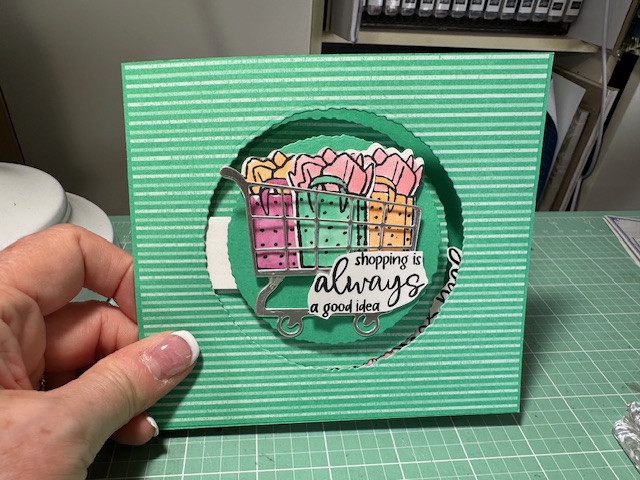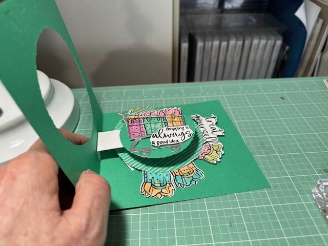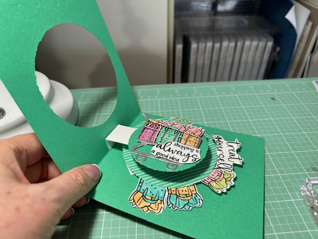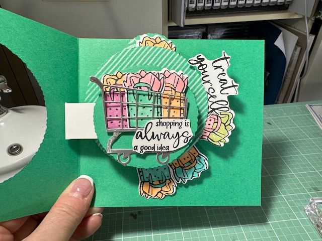 Such a very cool Rotating Circle Fun fold that I cased directrly from Fun with Kayla (Kayla Renee) youtube post on 5/5/24. She shows you how to make this card step by step. So fun. I made my version using different DSP and card colors. This card using the Attention Shoppers bundle 163644, Shy Shamrock Incolor card stock, Sky Shamrock, Petunia Pop, and Peach Pie Stampin Blends, and 2024-2026 In Color DSP 163777 and silver Fold for the cart. Such a fun card but you need to see it live its so cool.