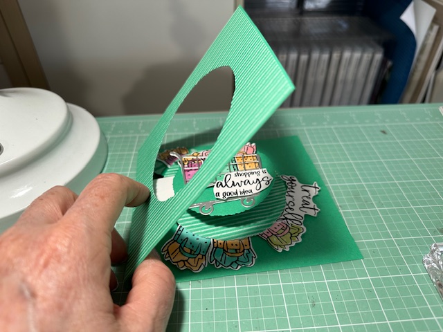 When you open the card the purses and sayings on the bottom will move to the top as you open the card This is an Amazing Rotating Circle fun fold. On this picture the bags and saying are on the bottom of the card but once you open it they move up onto the circle