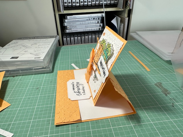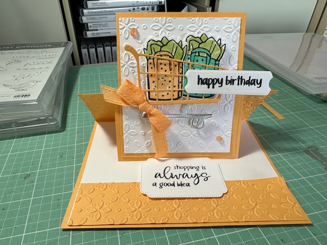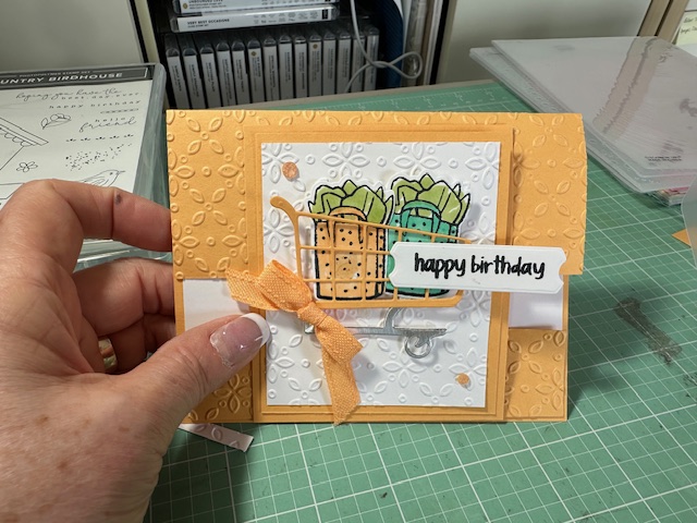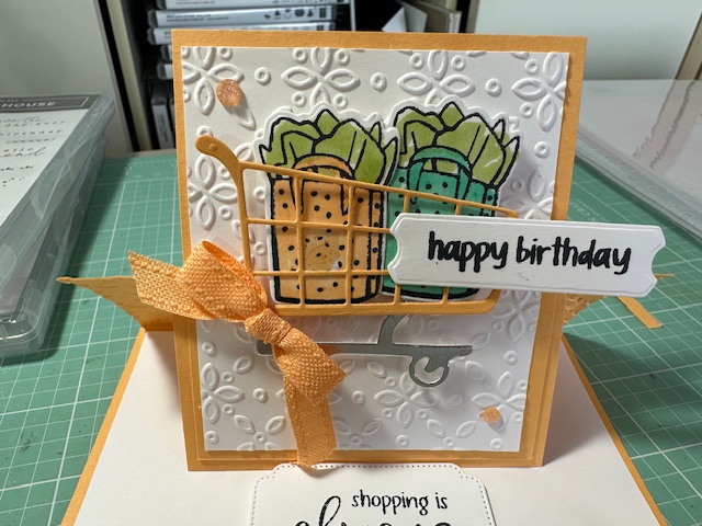Love this card Attention Shoppers card that I cased from Dawn Griffith from her You Tube video posted on 4/27/24. The Attention Shopper bundle 163644 is one of my favorite bundles in the catalog and had to case this very cool fun fold from Dawn for the ladies to make at my SAS. Love the new In Color Peach Pie, Eyelet 3D embossing folder, Unbounded dies, Peach Pie Ribbon and 2024-2025 Incolor Shimmer Gems. Check out Dawn’s video on how to make this cool fun fol.d