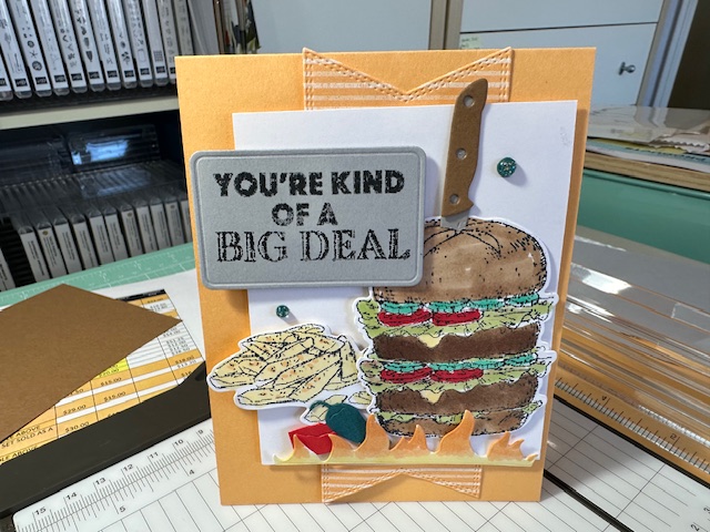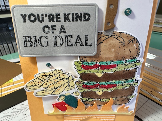 This this card that I cased directly from a sample from the new Main Catalog 2024-2025. Such a fun card using the Bistro Burger bundle 163650, Peach Pie card stock, InColor 2024-2026 DSP Petal Pink and Pretty Peacock Foil Gems 165679, and lots of stampin blends to color in the burger – I used Daffodil Delight, Granny Apple Green, Pecon Pie Light and dark, Poppy Parade, Shy Shamrock, and Peach Pie. Such a fun card and a great guy card. Enjoy my friends.
