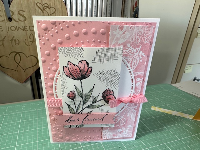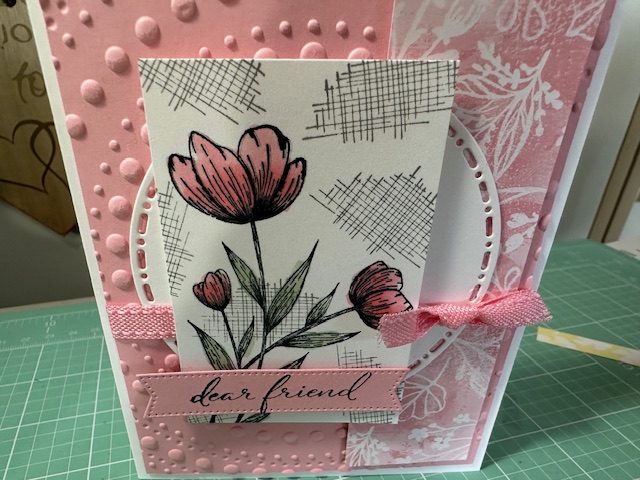 Love this card I directly cased from Diane Evans Youtub Video on 4/16/24. Love the layout, love the Pretty in Pink colors,, stamps and dies. Such a great bundle 163730. This card is all about all new items from the Main Catalog 2024-2025. Dotted Circle 3D Embossing Folder was used to emboss the Pretty in Pink on the front of the card. Unbound Beauty DSP, 163372, Pretty in Pink Ribbon 163784, Stylish Shapes dies, 2024-2025 In Color Shimmer Gems 163781. This card is all new stuff and lots of great items on this card. Just love this and had to make it as one of my cards at my May SAS.