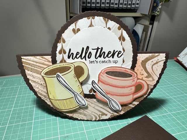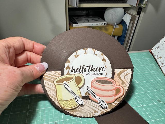 Totally Cased this very cool circle card from Dawn Griffith Blogpost on 2/19/24. Loved it so much I had to make a sample for my blog and my March SAS. The Deckled Circle dies did all the work on this card along with the Latte Love bundle 163461 and A Little Latte DSP 163453. So much fun and what a great surprise for anyone on your list. Very cool Card.
