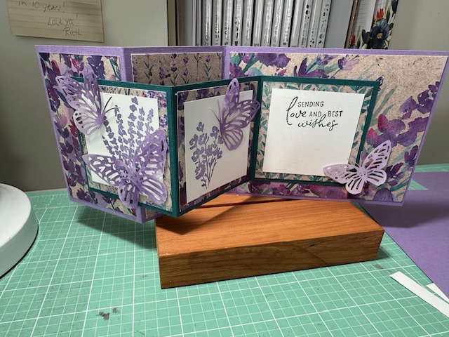 Love this very beautiful fun fold card that I cased from Patty Bennet Youtube Video posted on 1/24/24. So the colors, the use of the cut out butterflies (Paper Butterfly Accents 162612,) Painted Lavender stamp set 162594 & Dies 162596, and Perennial Lavender DSP 162593. Its an easy fun fold to make so check out her video on how to make this beautiful fun fold card. Everyone loves Fun folds