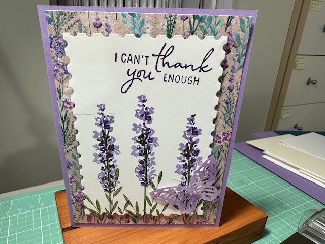 Cased this card from Stamp with AmyK Youtube video 1/24/24 – Painted Lavender dies cut out the white the flowers are stamped on.