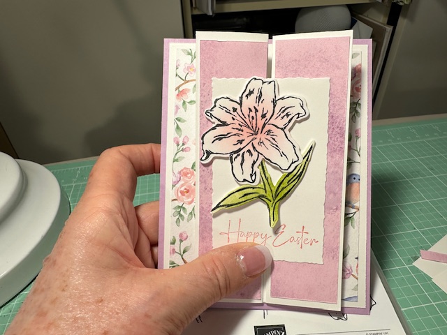 Love this very pretty fun fold using the Easter Lillies Bundle. I cased this card from Rustic Barn Card Video on 1/23/24 and loved this layout, the colors, the DSP used (now a retired Sell-a-bration paper). Fresh Freshia card stock along with the DSP and white makes such a pretty card. I used the blending brushes to brush the Fresh Freshia ink and Granny Apple onto the flowers and stems. The white main piece was cut out using the Deckle Rectangles dies (a retiring product so get it now if you want these great dies).