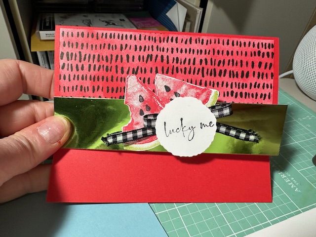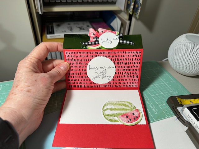Love this Watercolor Melon Stamp set 162962 Free during SAB with a qualify $50.00 order) and Happy & Heartfelt Stamp 158005. I cased this card from Wendy Lee from her Youtube video posted in Dec 2023. Loved it so much I knew I had to make it for the Feb SAS held this weekend and show off what you can do with this set with a cute fun fold.