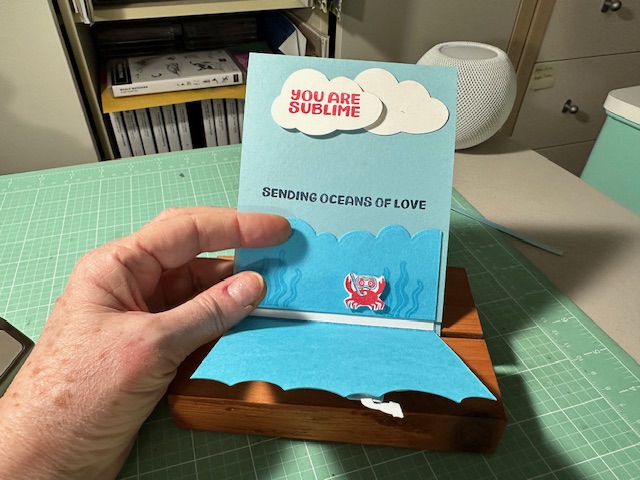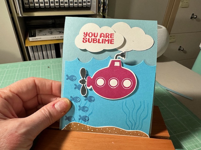 Submarine Life Bundle 162774 – Stamp set and Punch. I cased this card from Ruth’s Stamping Corner on her Youtube video posted a month ago (so about 12/30/23). Loved this cute fun fold with this bundle and knew it would be a great SAS card for the girls to make.