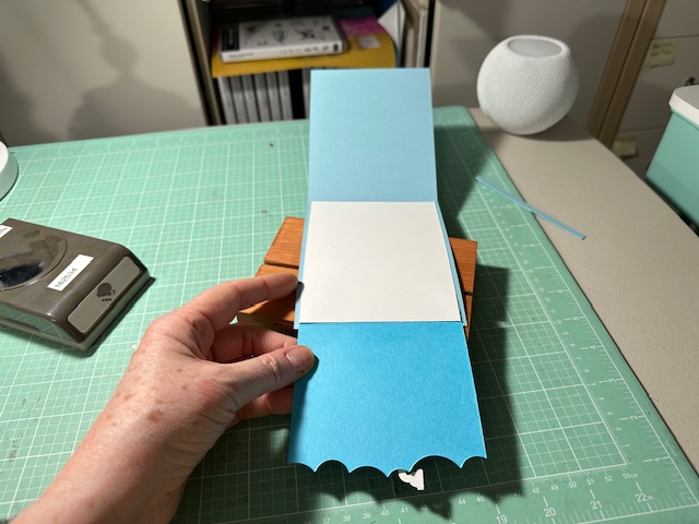 Assemble the card as shown with the Tahitian scored piece attached to the bottom of the Balmy Blue card (which makes this card a fun fold), then Tape the white piece on top of that, then tape the other cut out Tahitian card to the front of the Balmy Blue card. The sand at the bottom you will cut this piece out.
