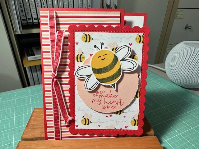 Bee My Valentine Bundle 162554 – Stamp and Punch. Love this Stamp set and dies as you can make so many different cards with the supplies and the DSP. The bee punch is so easy to use and fun. Makes quick cards.