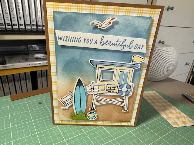 Beach Day Bundle 162800. What a great bundle and such a cool card to be made. You use stampin Ink and blending brush to make the sky and sand and then you stamp the images and cut out with the coordinating dies. Easy, fun card for anyone on your list.