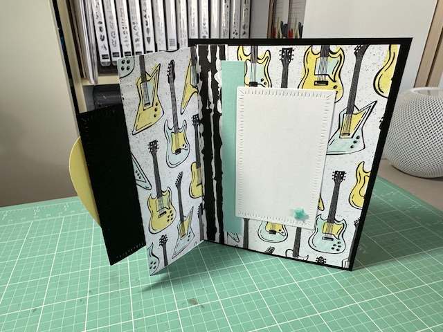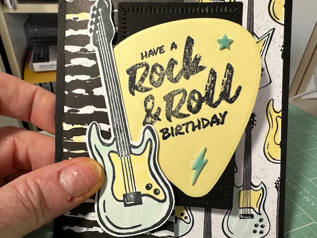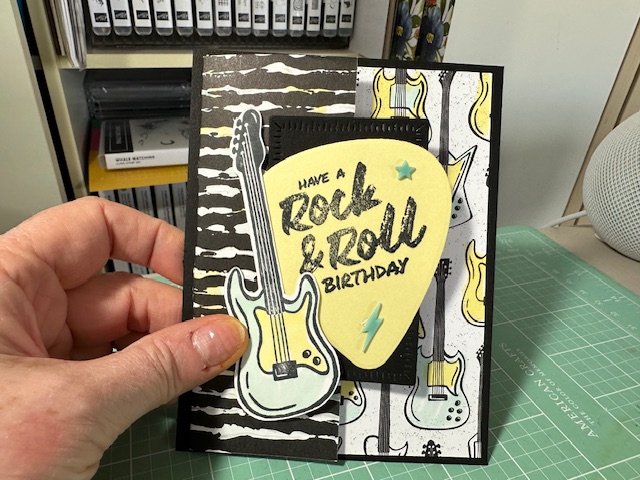 Rock Star Bundle 162706 and what a cool fun fold I cased from Lynn Dunn pdf from an email she sent 2 weeks ago called One Sheet Wonder Fun Fold. I loved it and knew I had to case this Rock Star card from my Feb SAS. The only change I made to the card was adding the Guitar to the front of the card.