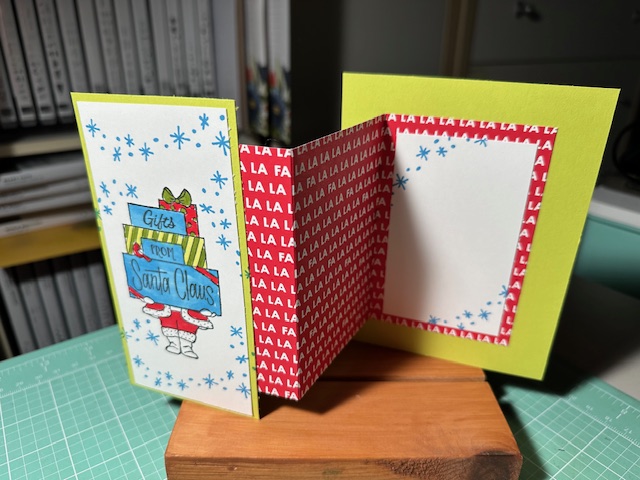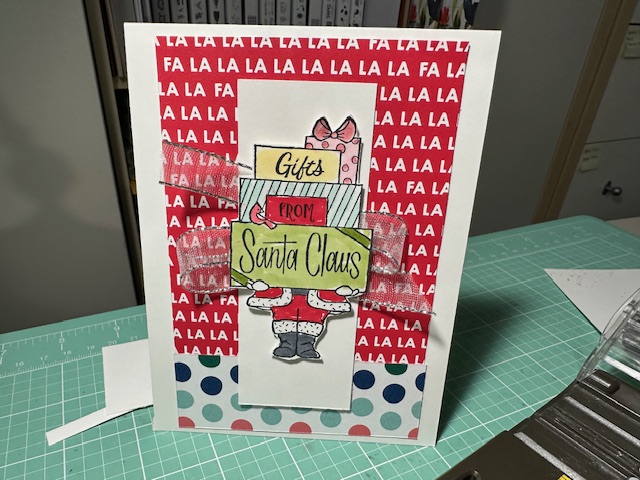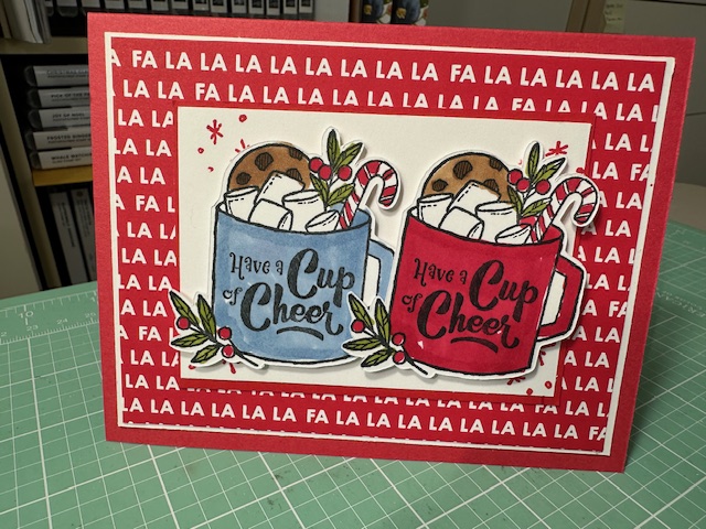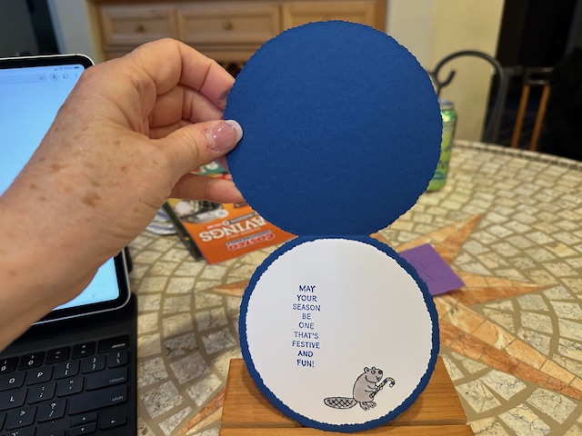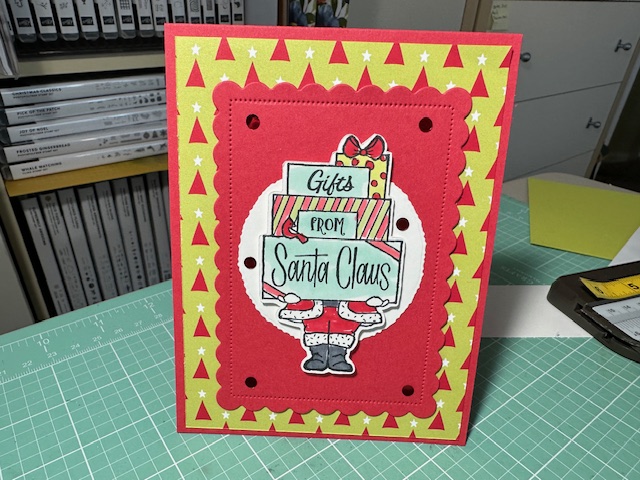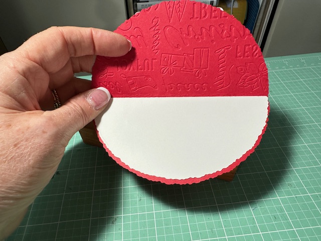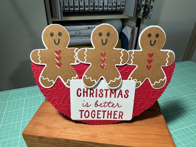 Is this card not the cutest ever and so cool using the Deckled Edge dies to make the entire card. I cased this from Stampsntea Youtube Video posted on 10/30/23. The front of the card is embossed with the Christmas Tidings embossing folder. You use the largest Deckled Edge die and cut it out in red, then use the second largest circle for the inside and cut the white piece in half to fit the inside of the card. The Gingerbread men was stamp in Pecon Pie. Such a great card.. one of my favs.