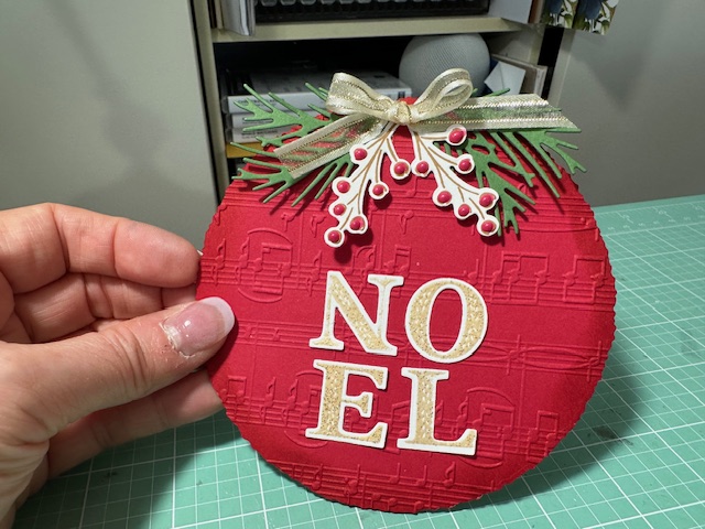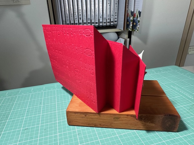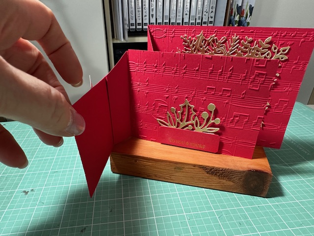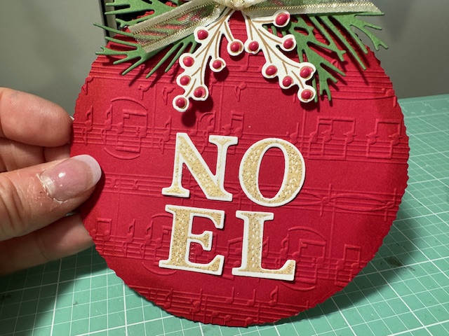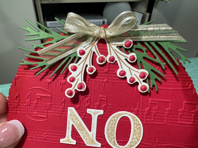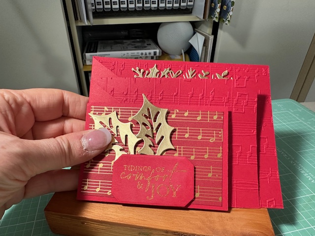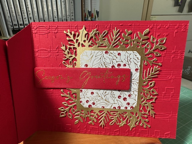 Is this card not the most beautiful card. This Joy of Noel Bundle 161967 and the Music Embossing folder, gold paper, just makes this very cool panel card. I cased this card from Sue Campfield from her Youtube V on 10/23/23. Its a great cards to make and not that hard if you follow her video and directions. Enjoy