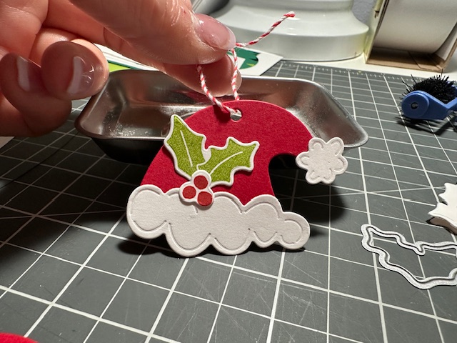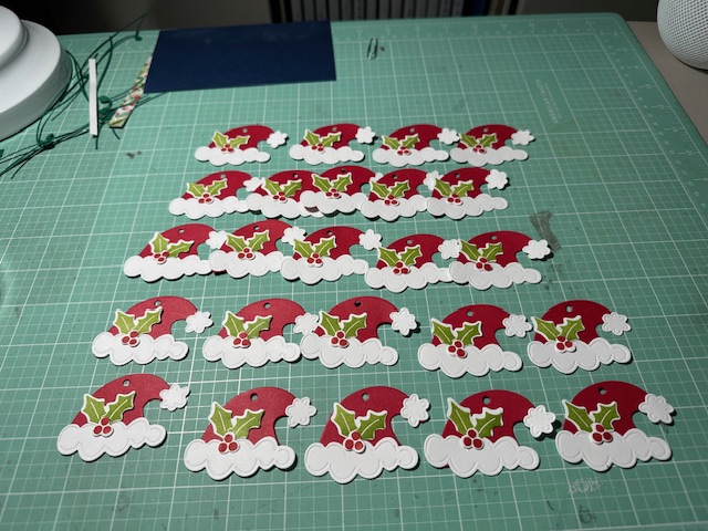 I love to make special bag tags for the girls bags at my SAS so they know which bags is there if the set it down or just when it crazy with a lot of stampers and they lose track of their bags. These were so fun to make using the Sending Cheer Bundle 162052. As you can see in the picture above you stamp some of the items and then punch them all out with the dies. So easy and so cute.. I love, love, love these.