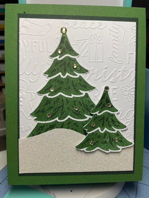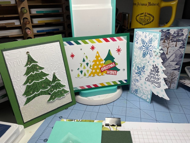 Merriest Trees Bundle 162047 wonderful door prize my sister Ruth made for my Nov SAS that we held on Nov 10th and 11. Everyone that comes to my SAS will go home with 9 cards that they made, 3 more cards as door prize cards and 2 different fun treats to take home. My sister Ruth flies out to CA from Florida every year to help me with this huge SAS and makes several of the door prize cards for me. She did a great job with this one making three different cards with the Merriest Trees Bundle. Great job sis and we had a great weekend after enjoying our Annual Sisters week. I miss my sister already as it went way to fast while she was here. Love you Ruth.