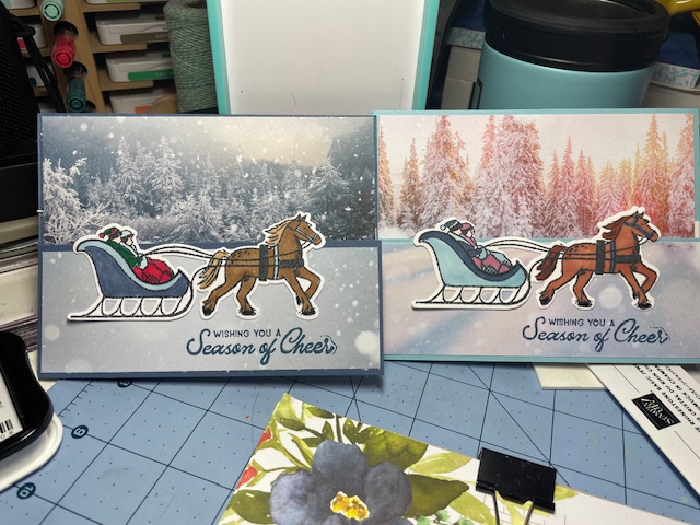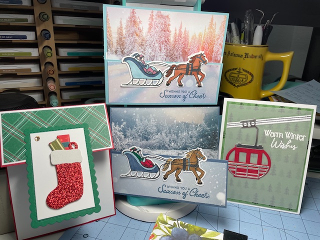 Wonderful door prize my sister Ruth made for my Nov SAS that we held on Nov 10th and 11 using 3 different stamp sets and bundles to make these cards. She used Sending Cheer bundle, Above it All Bundle, and Sleigh Ride Bundle. Everyone that comes to my SAS will go home with 9 cards that they made, 3 more cards as door prize cards and 2 different fun treats to take home. My sister Ruth flies out to CA from Florida every year to help me with this huge SAS and makes several of the door prize cards for me. She did a great job with this one making three different cards from 3 different stamp sets. Great job sis and we had a great weekend after enjoying our Annual Sisters week. I miss my sister already as it went way to fast while she was here. Love you Ruth.