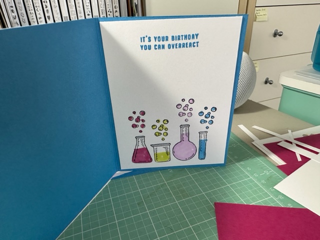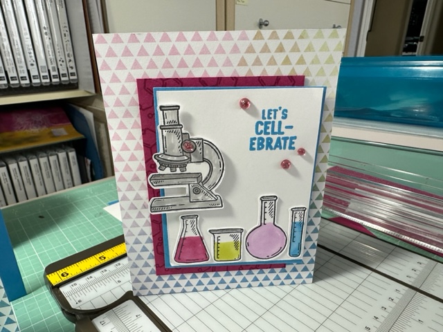 Its a Science Stamp Set 161554. I loved this set and then when I saw a shorts video from Karen Kzenzokovic posted on 5/9/23 I knew I had to make this card for the girls at this SAS. I was right it was a hit.