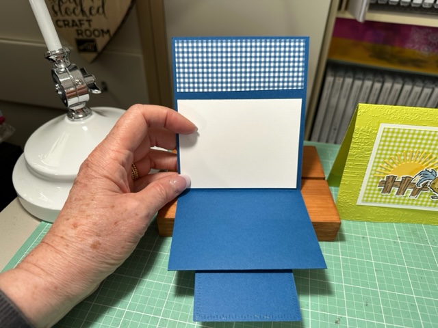 Take the 6 x 4 Fresh as a Daisy DSP and place the DSP on the White Card front on an Angle. Then Tape it down and cut off the edges.