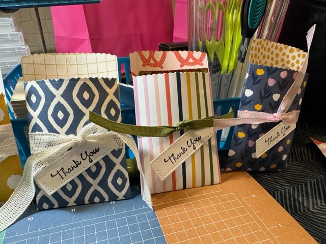 I love making special treats for the stampers that come to my SAS. I made these cute pocket treats from an old pocket die that is now retired and the paper I used is also an retired DSP but thought I would use it to make my special Ghridelli Choc holder. Also have to have some kind of candy treat for them to take home, or eat the candy why they stamp. These were so fun to make and the Ribbon added another special touch.