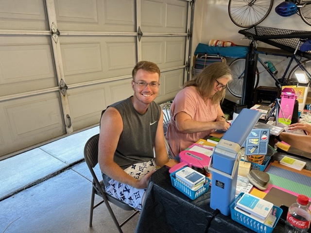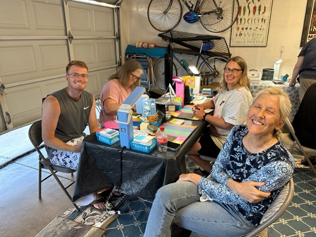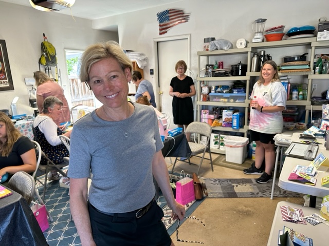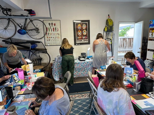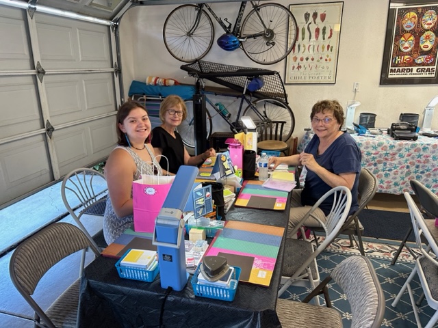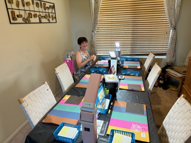 Tables 2 and 3 in my garage. I have everything on the tables for them to make the cards except they bring their own tape as I don’t supply it anymore, its just too expensive now. Our July SAS it was hot outside, so I left our 3rd garage by open and then had two big fans blowing in the room and once they were going the garage was not bad at all. Thanks to all my stampers and their support of my little business. You are the reason I am able to have these SAS at my house, so thank you.