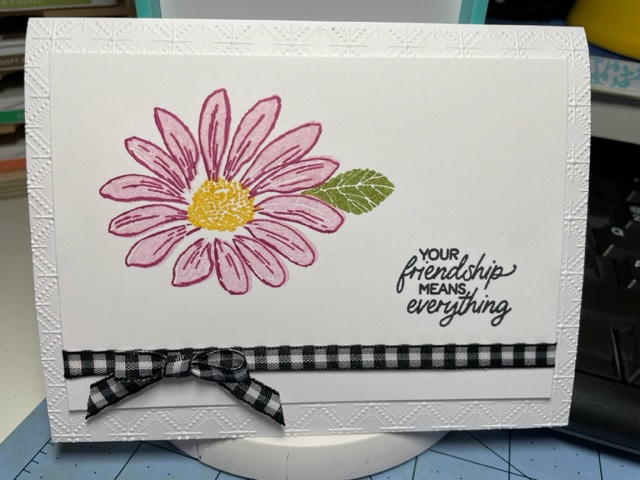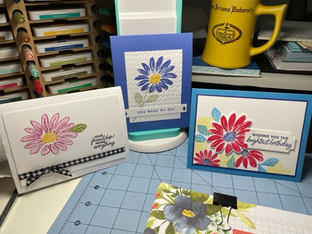 What beautiful Daises cards these are that my sister Ruth made for my July SAS. This Daises bundle 161297 is a great bundle as it makes beautiful cards. My sis did a great with these cards. As you know the girls make 9 separate cards at my SAS and then as a bonus they get to go home with 3 more cards, some special treats I make all for $40.00 Dollars. Thanks to all my stampers for their love and support. Thanks Sis, for making such great cards.. love them.