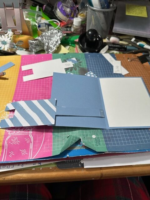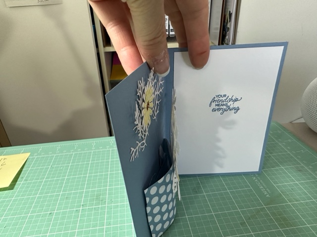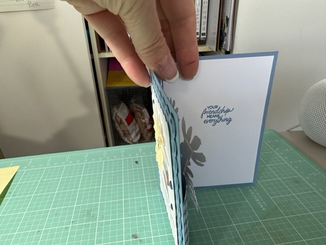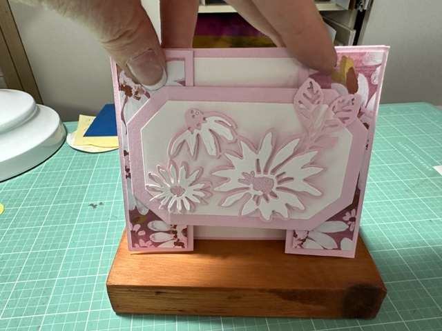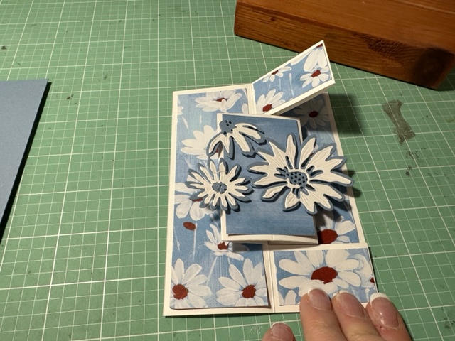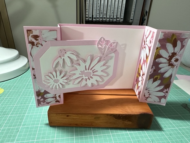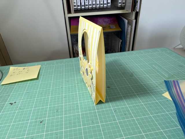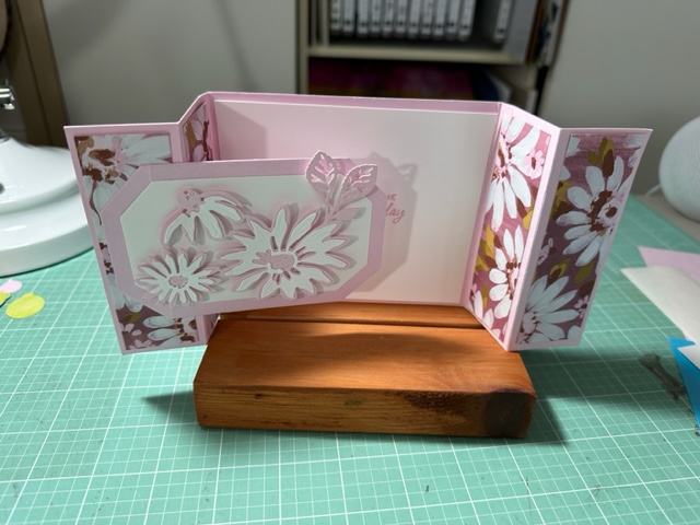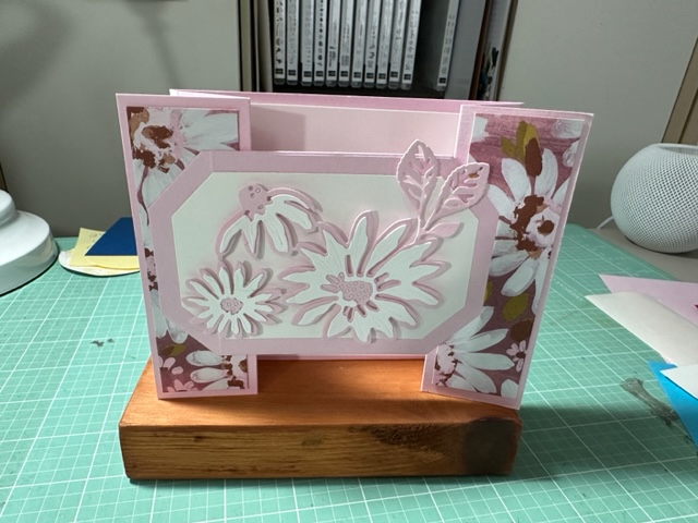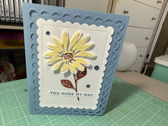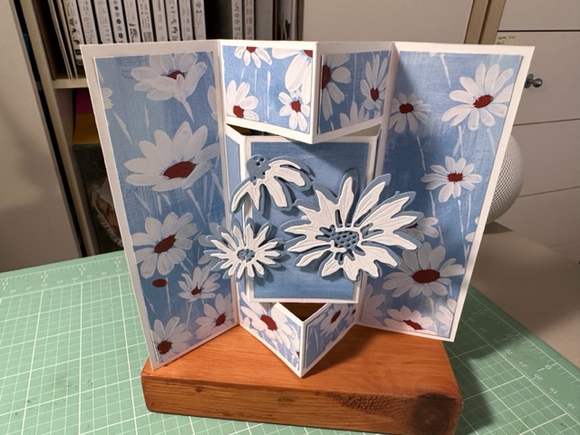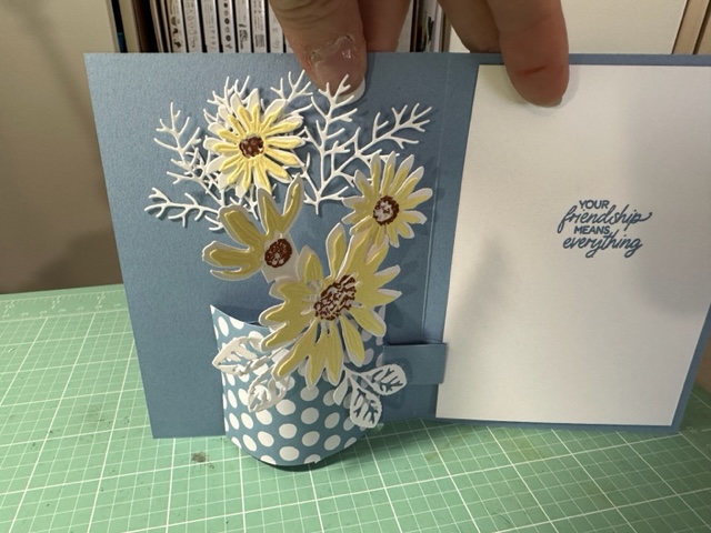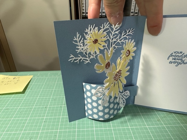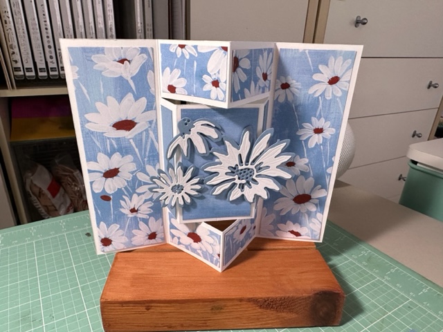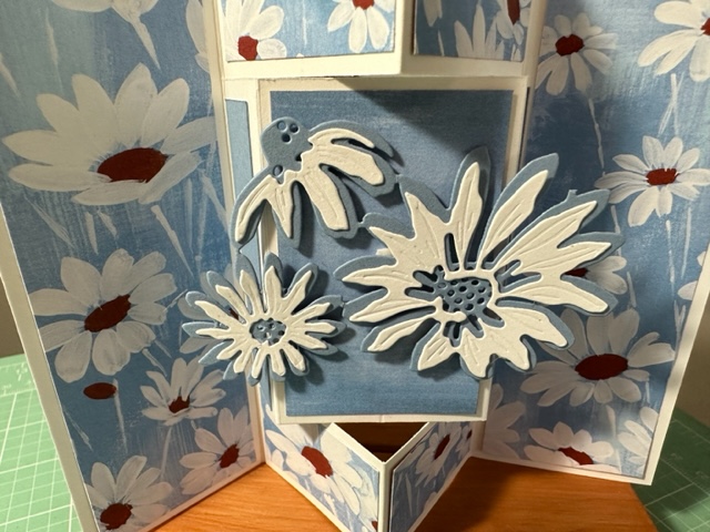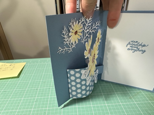 Love, love, love this fun fold I saw on another blog and made my own version using the Cheeful Daisy Bundle 161297 and the CountyCorner Dies 161472, Fresh as a Daisy DSP161289, Bubble Bath Card Stock 161718. As you can tell I had a lot of fun with this Cheerful Daisy bundle and made lots of cards. I got the idea for this card from Berverly Morales Youtube Video on 4/18/23 and made the front of my card different than hers as she had way more stuff on her front so check it out. Measurements for this card Bubble Bath card stock cut a 4 1/2 x 11 and scored on the 11″ side at 1 1/2, 2 3/4, 8 1/4, 9 1/2. The Fresh Daisy DSP was cut 4 times at 1 x 4. Then I cut the bubble bath and white card stock using the Country Corners dies and then cut out the flowers using the Daisy dies. Such a pretty card with all the items and a fun, fun fold. Enjoy my friends.