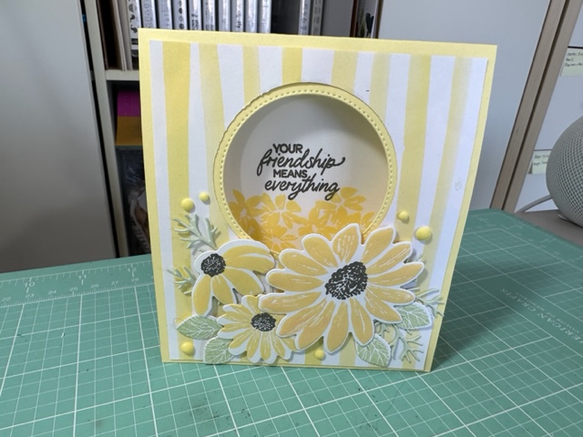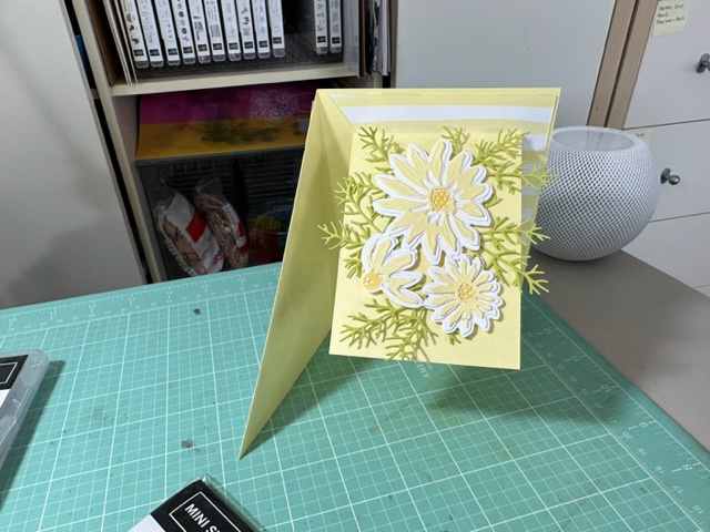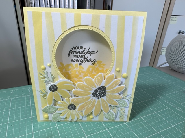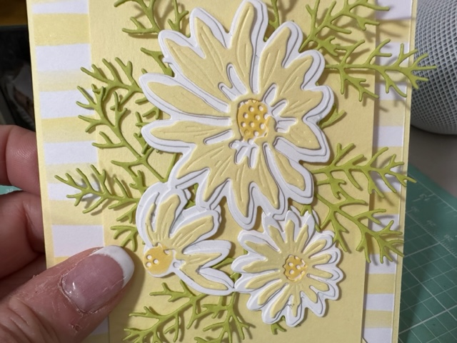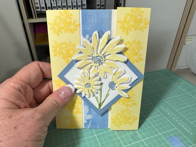 Such a fun set and the dsp Cheerful Daisy bundle 161297, Fresh as a Daisy DSP 161289, Lomon Lolly, Boho Blue and White Card stock. So fun. I am pretty sure I cased this idea from another demo but can’t remember who. Such a fun bright card. Love this bundle and the fun cards you can make it. More samples to come.