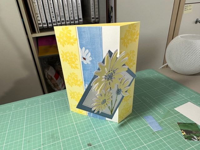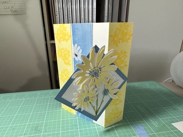 Love this really cool fun fold card with using the Cheerful Daises bundle 161297. I cased this card from Cindy Lee Bee Designs Video on 4.19.23. I love how the Fresh as a Daisy DSP 161289 is the main product of the card. I cut out the Daisies using white and Boho Blue card stock and then used the Fresh as a Daisy DSP to finish the card. Such a great Fun fold