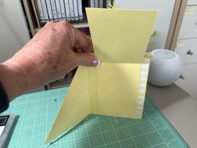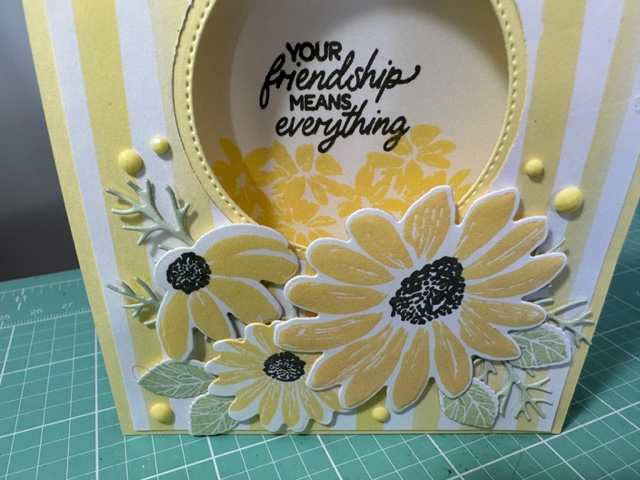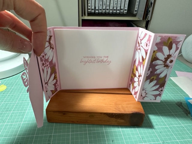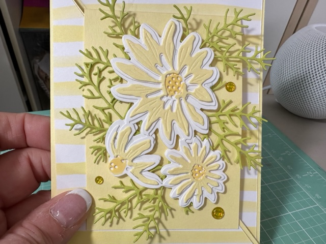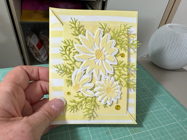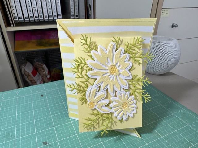 Love the Cheerful Daisy bundle 161297 and all the beautiful cards you can make with this set. I love the Lemon Lolly card stock and then we we had the Bright & Beautiful DSP 161449 to the front and then the pretty colored stamped and cute out Flowers, leaves and the cole hole, it make a great fun fold. I cased this card from a Fun Fold Class by on y go stamping with Heide Collins Video on 5/3/23. Check out her video on to make this fun fold.