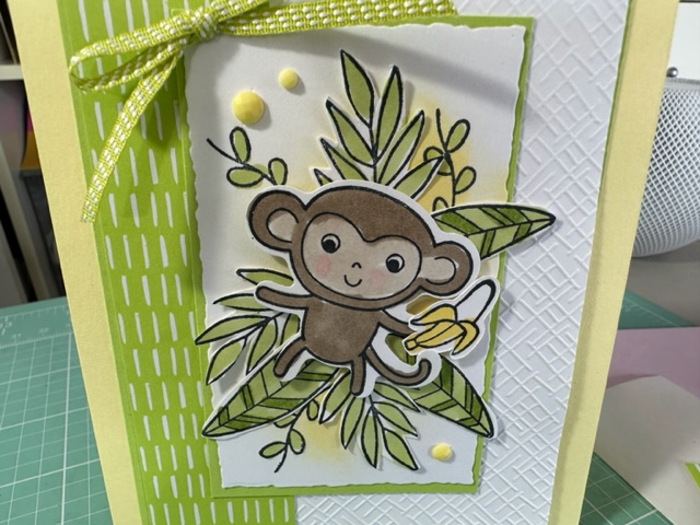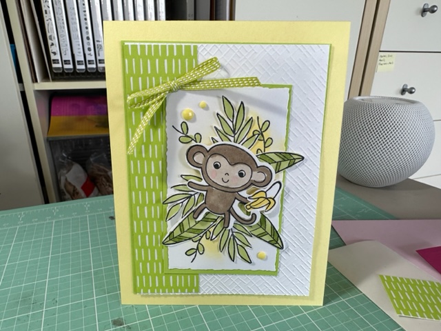 Love this cute Little Monkey card that I cased from Dawn Griffith Youtube Video on 5/3/23 from her Facebook Lives she posts on Wednesdays. Such a cute and fun card using the Incolor DSP, the Little Monkey bundle 161379, Really cute card.