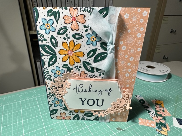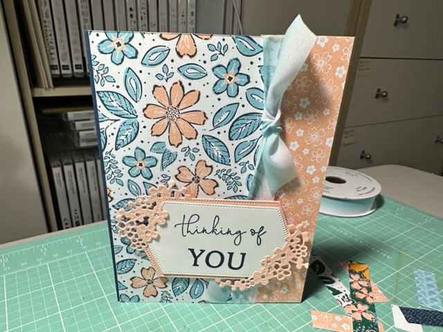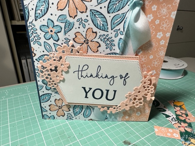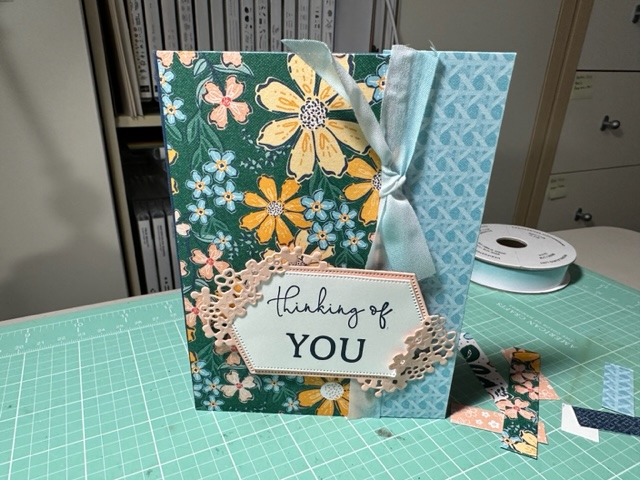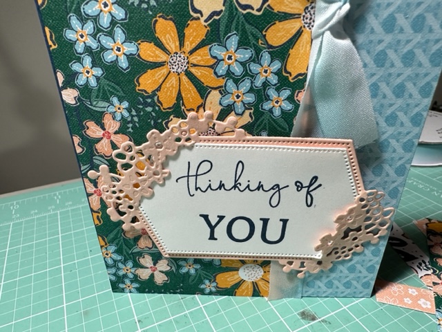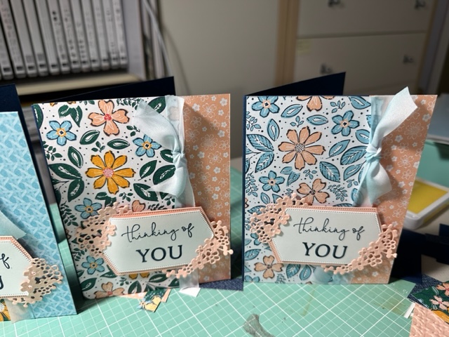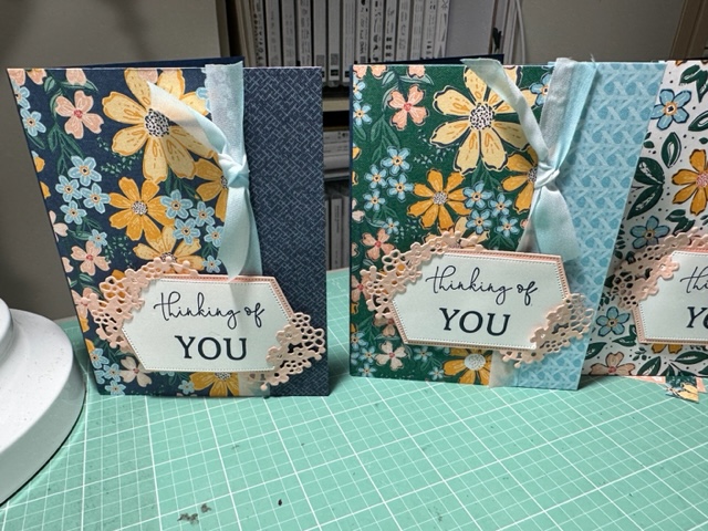 Look at all these beautiful cards made with just the Regency park DSP 160559, Sentimental Park Bundle 160567 and the Balmby Blue ribbon, and Petal park Card stock. Love these cards and the first example was cased from Wahter City Stamping Youtube video on 1/20/23 and then made the next three my own versions, I think.. I also may have cased all three but can’t remember. Anyway, 4 great cards using the same design and differnet DSP from the Regency park 6 x 6 DSP that expires at the end of April. Get it now as it great paper.