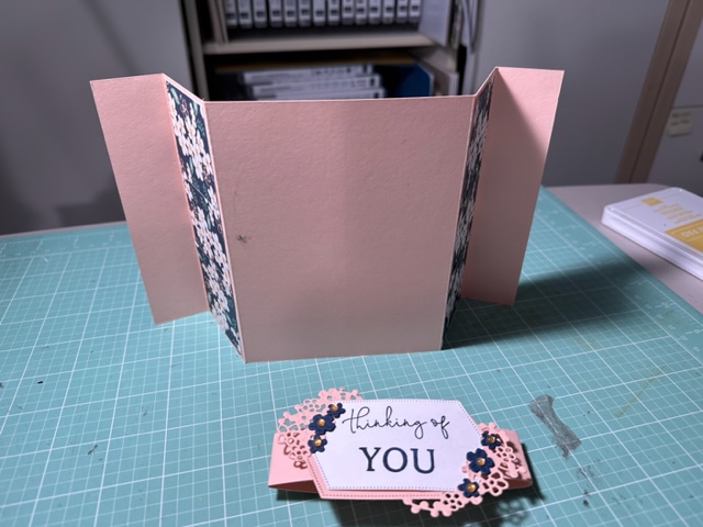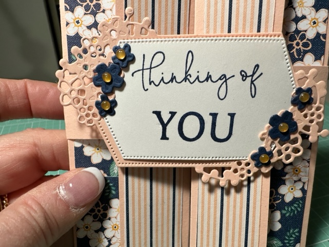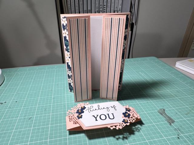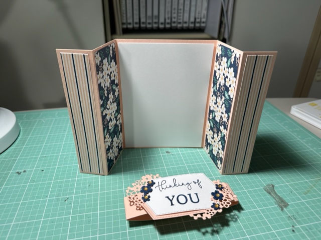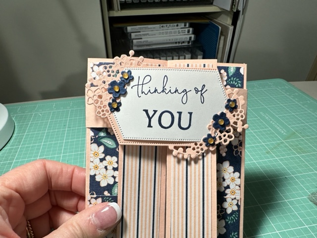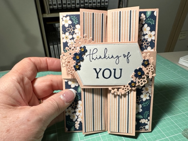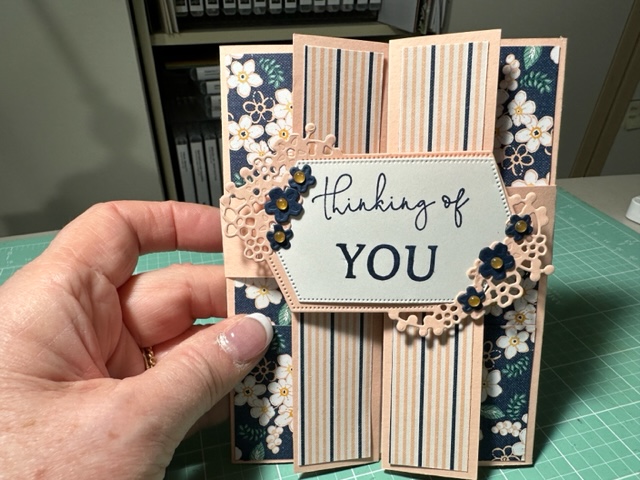 Love, love, love this fun fold. I totally cased it from Margaret Knight Creative with Margaret blog post on 2/23/22. I loved the colors, the fun fold, fold everything. She did a great job on this beautiful card. Sentiment Park Bundle 160567 Regency Park DSP 160559, Adhesive Backed Milky Dots 160582. So pretty and anyone will be very lucky to receive this card in the mail.