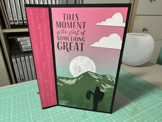 What a fun card using the Greatest Journey Bundle 160594. I cased this card from Lena Guess Youtube Video on 2/18/23. Love this bundle and sad it is being retired. The Enjoy the Journey 12 x 12 DSP 160586 makes the cards and then you just have to add the saying and cut out the person and clouds using the die cuts. Easy peasy. Fun set.