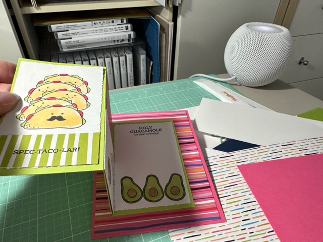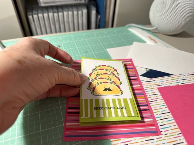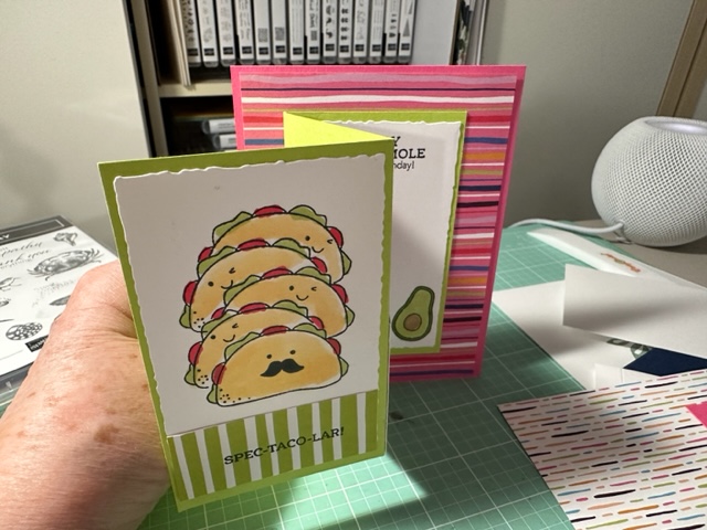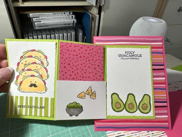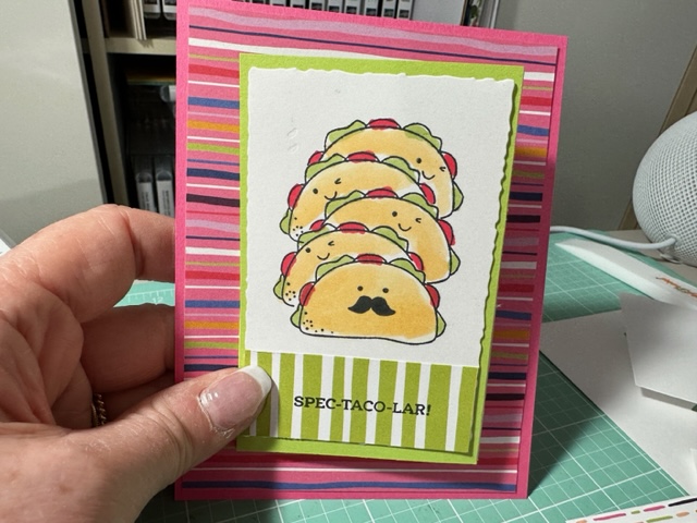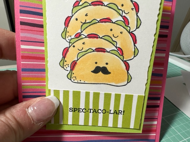 Taco Fiesta Stamp Set 160732. Love this card and it was a direct case from Erica Cerwin’s monthly card club that I joined under her. My card is different from her’s as I used different DSP and paper but still the same concept. I can’t give you all the Paper Supplies or cutting instructions as that is private to this group. It was a fun card to be made and it is also a gift card holder. Great card. The cool part of this card is the masked image you use to stamp multiple tacos, using SU masks paper that they sell. Very cool and fun.