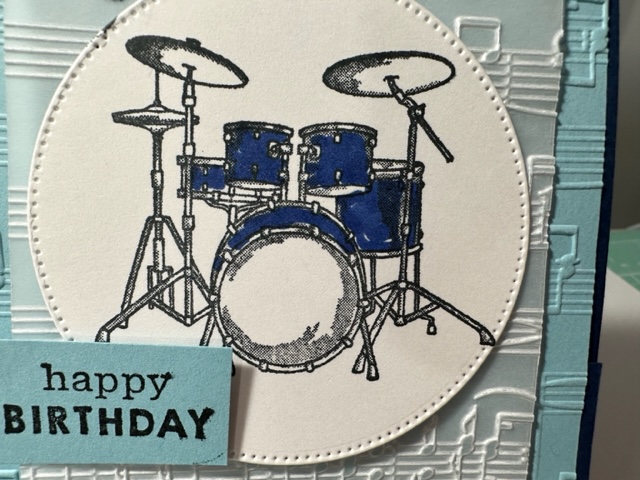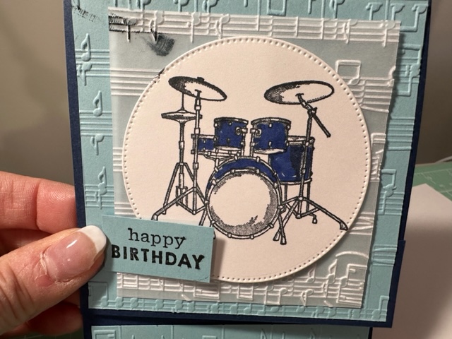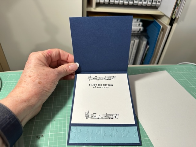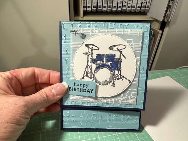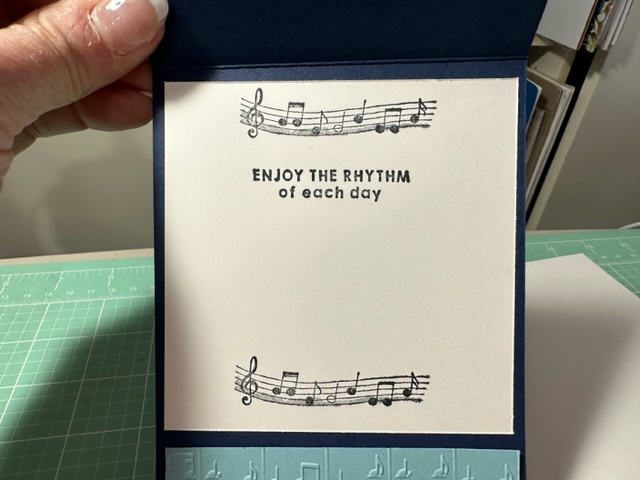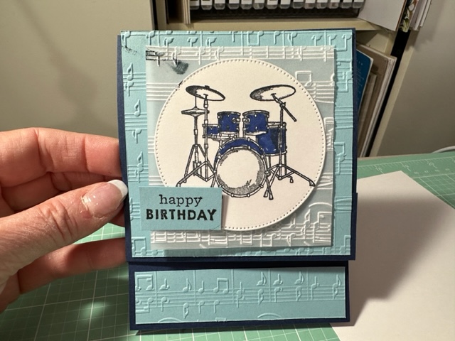 Love this fun fold I created using the Enjoy the Rythem Stamp set and the Music Embossing Folder. I loved this set and all the items it come with and came up with the card with the basic being the Music folder that embosses the music, so cool. It was a fun card to make.