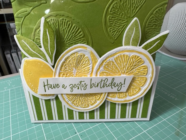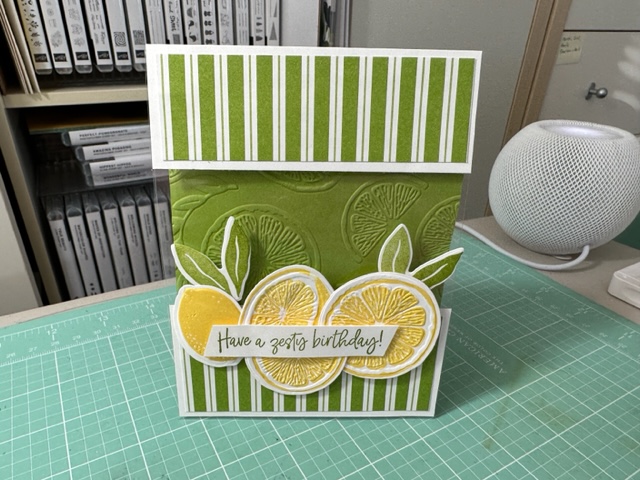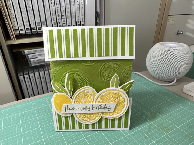 Love this bundle Sweet Citrus Bundle 160645 includes stamp set, dies, and Sweet Citrus Hybrid Embossing Folder – pg 49 of Mini Catalog as it makes so many cute cards and you will see a bunch of them on my blog coming up. I got the idea for this card from another demo but I can;t remember who I am sorry. Loved it so much it was a fun card for the girls to make at the March SAs.