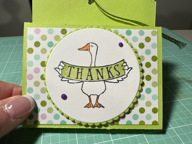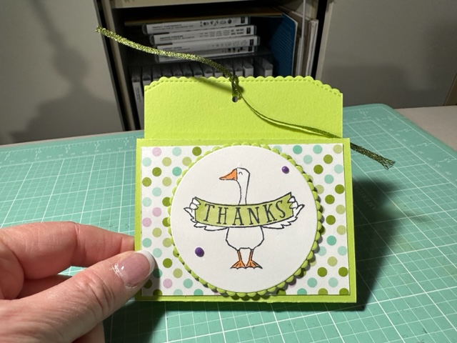 The cutest card right.. its a really cute gift card holder and I cased this card from Dawn Griffith from her Youttube post about a month ago called Friendly Ghome live Card Class # 19.. She did her card in balmy blue but I changed mine to this Fresh Freshia card. Its so cut and again its another gift card.