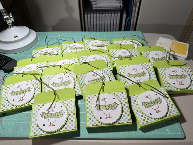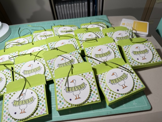 I made these cute Silly Goose treat holders that were cased from Angie at Stampinwithamore. Youttube post on month ago called Craft the Easter Treat Box. It was so such and different, I wanted to make it for treats for the girls that attended my Feb SAS. I also show above how I made them. Check out Angie;s Youtube if you want to make them.