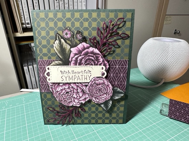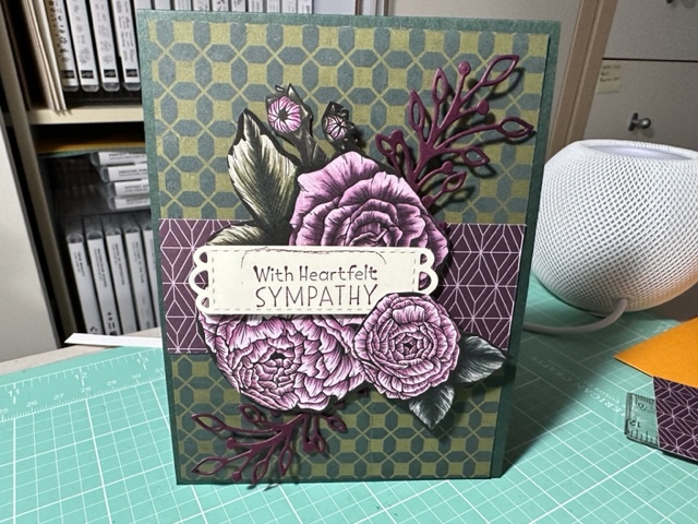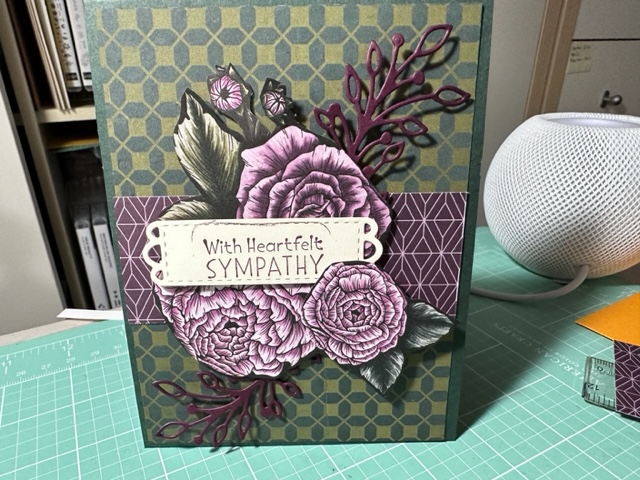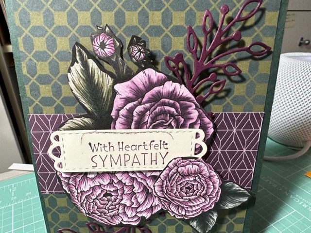 This card is all DSP to make the card except the tag. This DSP is a Free DSP during sale-a-bration and is called Favored Flowers 12 x 12 DSP free item No. 160833. Its is free with a qualify $50.00 order during SAB. At first I did not like the paper as it was dark and a lot of patterns, but once I put this card together (as case from the SAB catalog) using all paper, the flowers were cut out from the DSP, etc). The Blackberry bliss stems were from Framed Florets dies 160623, the vanilla tag was cut from the Meadow dies 155852. I fussy cut the flowers out of the pattern paper to complete this card. Its great to know you can make a pretty card with the cut out flowers and the DSP.