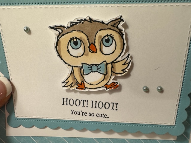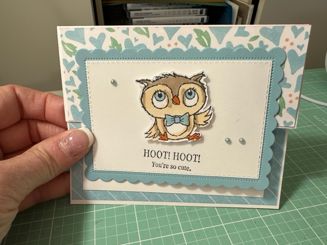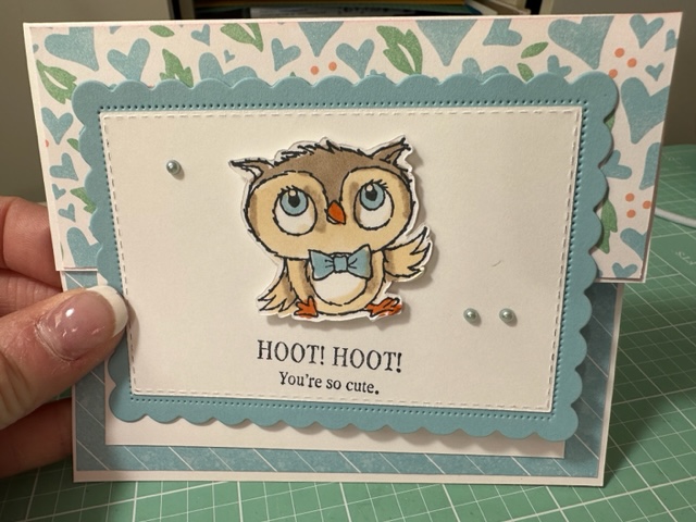 Is this card not the cutest ever… yes it is. I totally cased this card from www.stampinwithamore.com from her Youtube video she posted 3 days ago. I loved it so much I had to make a sample for my blog and the Feb SAS. This is such a cute fun fold and the owl is so darn cute. The adorable Owl set is a free item with a $50.00 order Free 160269 which is on page 4 of the SAB Catalog. Just too cute and a great card to show him off. This is an easy fun fold and when you place it with the Country Floral Lane 12 x 12 DSP 160375 is just works. Angie did a great job designing this card and showing you how to make it on her Yourtube channel.