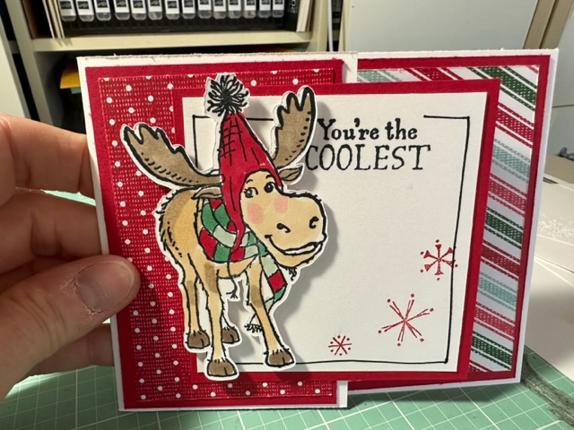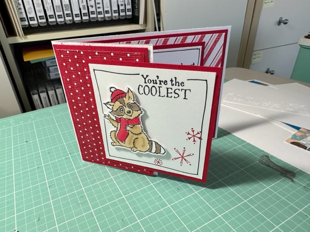 All Bundled up cards 159824. I cased these very cute fun fold from Stampinwithamore on her Youtube video posted about 2 months ago titled Easy Christmas Fun folds. Loved these cards and love the All bundled up stamps.. such so cute as you all know I love cute stamps. These were fun to make.