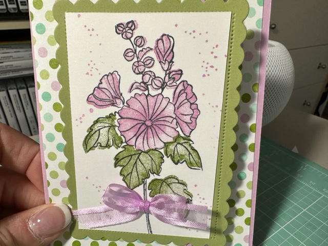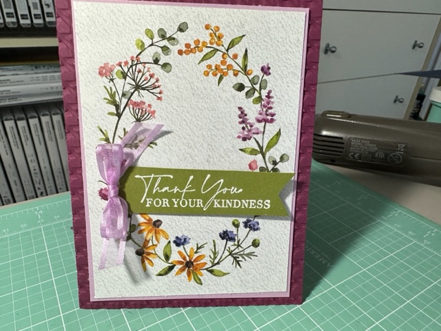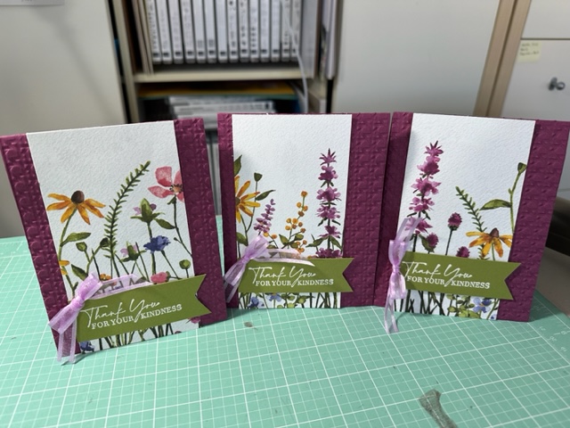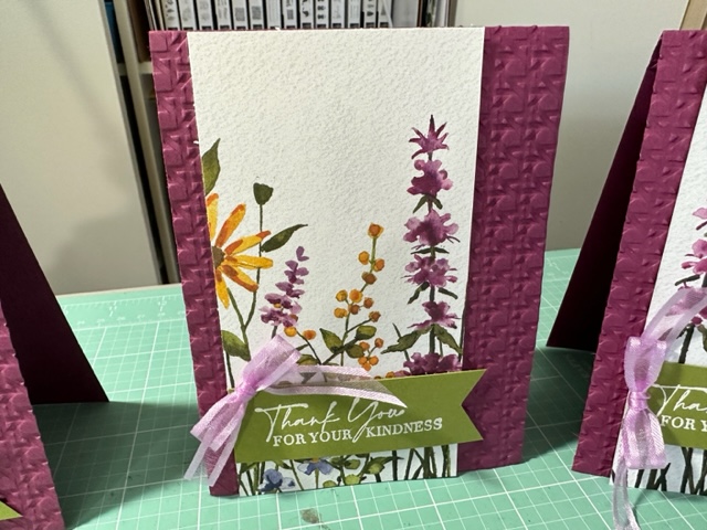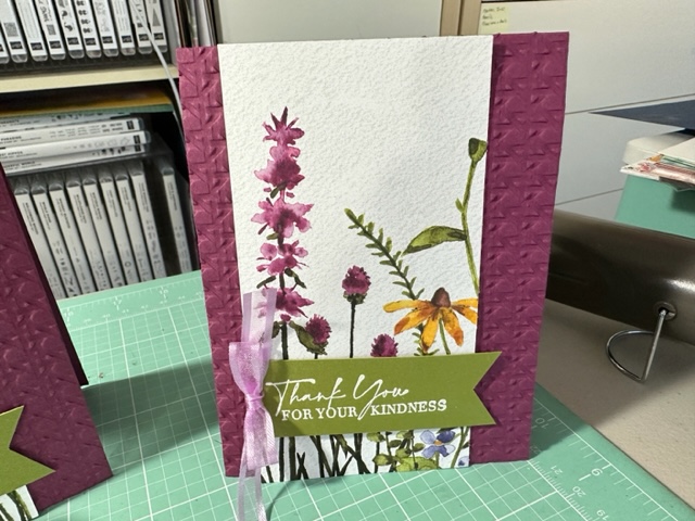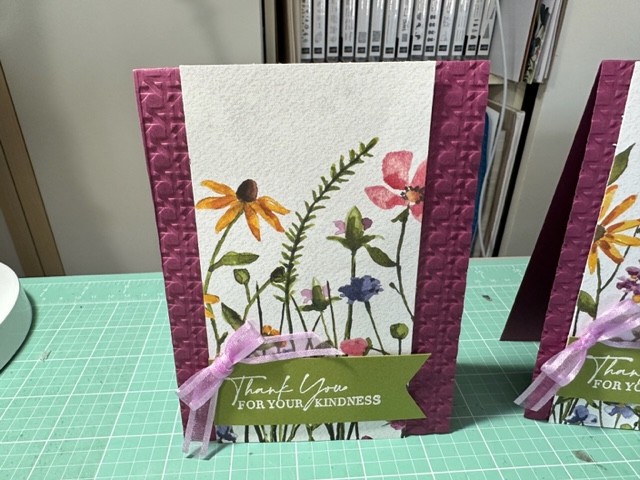 Again, I made more beautiful cards using another sheet of 12 x 12 Designer Paper from the Dainty Flowers 12 x 12 DSP Free SAB item 160834 with a $50.00 order. Love this and I got 8 cards out of one sheet as I cut the DSP at 3 x 5/12. Trust me you have to see this paper live as its so beautiful and looks like its on watercolor paper. Again I used Rich Razzleberry cut at 4 1/4 by 11 and embossed it using the new Cane Weave 3d Embossing Folder 160580 given my card more texture. Then I cut the once piece (as you get two of these sheets in the pack) to 3 x 5 1/2 and attached it to the card front using Tape. Then I cute a piece of Old Olive to 1 x 4 and stamped the Thank you saying using Clear Stampin Emboss Power and then used the Heat tool to heat up the embossing power then used the Banner Punch to cut off the end. Made a bow with 2/8 Weave Ribbon Fresh Freesia. These card as Thank You for Christmas Gifts.