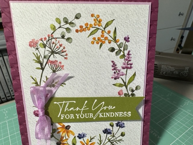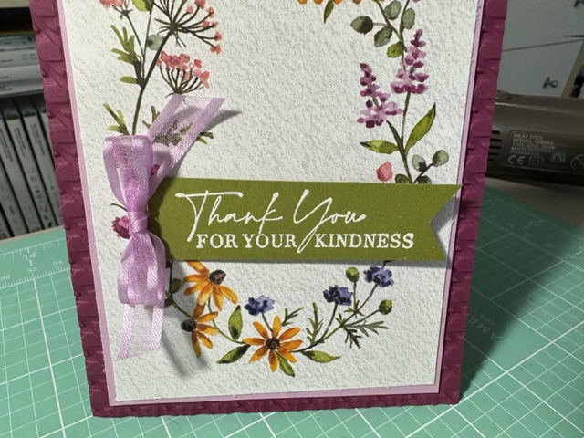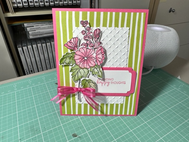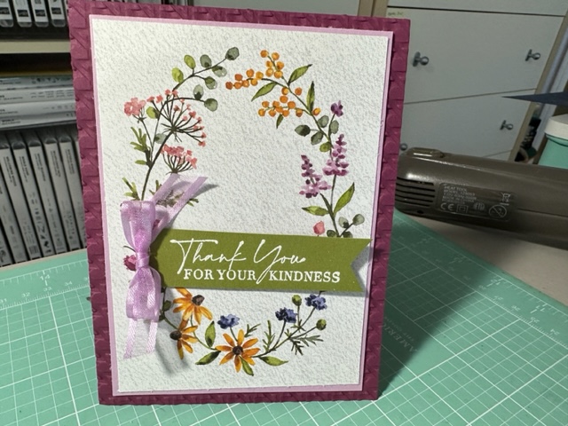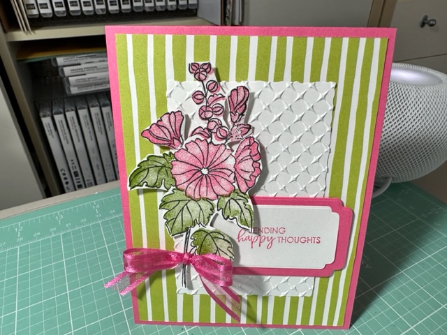 Place an order with me in January and you will receive this beautiful card as my Thank You. Love this thank you card as it was so super easy when using the Dainty Flowers 12 x 12 Designer Series paper Free SAB item 160834 with a $50.00 Order. This DSP is the best ever that SU has produced at least in my opinion and it makes the best simple but elegant cards. For my card I used Rich Razzleberry (cut at 4 1/4 x 11 scored at 5 1/2) as my card base and ran it thru the Big Shot using the new Cane Weave 3d Embossing folder 160580 (to give the card more texture) then cut out a Fresh Freesia piece of Card stock about 4 x 5 (trimming it down a bit) and then cut this great circle flower Design Paper from the Dainty flowers as there are two sheets of this one DSP (as you can get 8 circle pieces when you cut one piece of the DSP First cutting off the Flowers in the middle of the piece of DSP then I cut the flower oval at 4 x 5 1/2. ) This will give you 8 of these beautiful Flowers circles for any card. So easy and make the card so elegant. I cut the Dainty Flowers DSP down to 3 3/4 x 5 I think (don’t have the exact measurement.) I cut a piece of Old Olive and cut it down to 1 x 4 and then stamp the Thank You sentiment onto the card using Veramark Ink and then Clear embossing powder and used the Heat Tool to heat up the saying then used the Banners Pick a punch to punch out the one end. I used a dimensional to attached to the card front and made a bow using the Open Weave Fresh Fressia Ribbon 155615. Such a pretty but quick card which is what I needed as I am late getting my Jan Order Thank You card out. I had to finish making my 9 cards for the Feb SAS before I could make my thank you notes. Enjoy my friends.